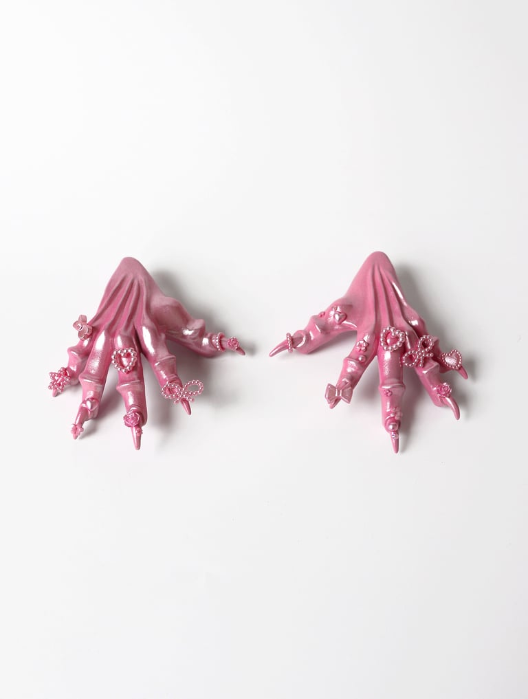 Pink lacquered resin paw earrings with glitter and small plastic accessories.